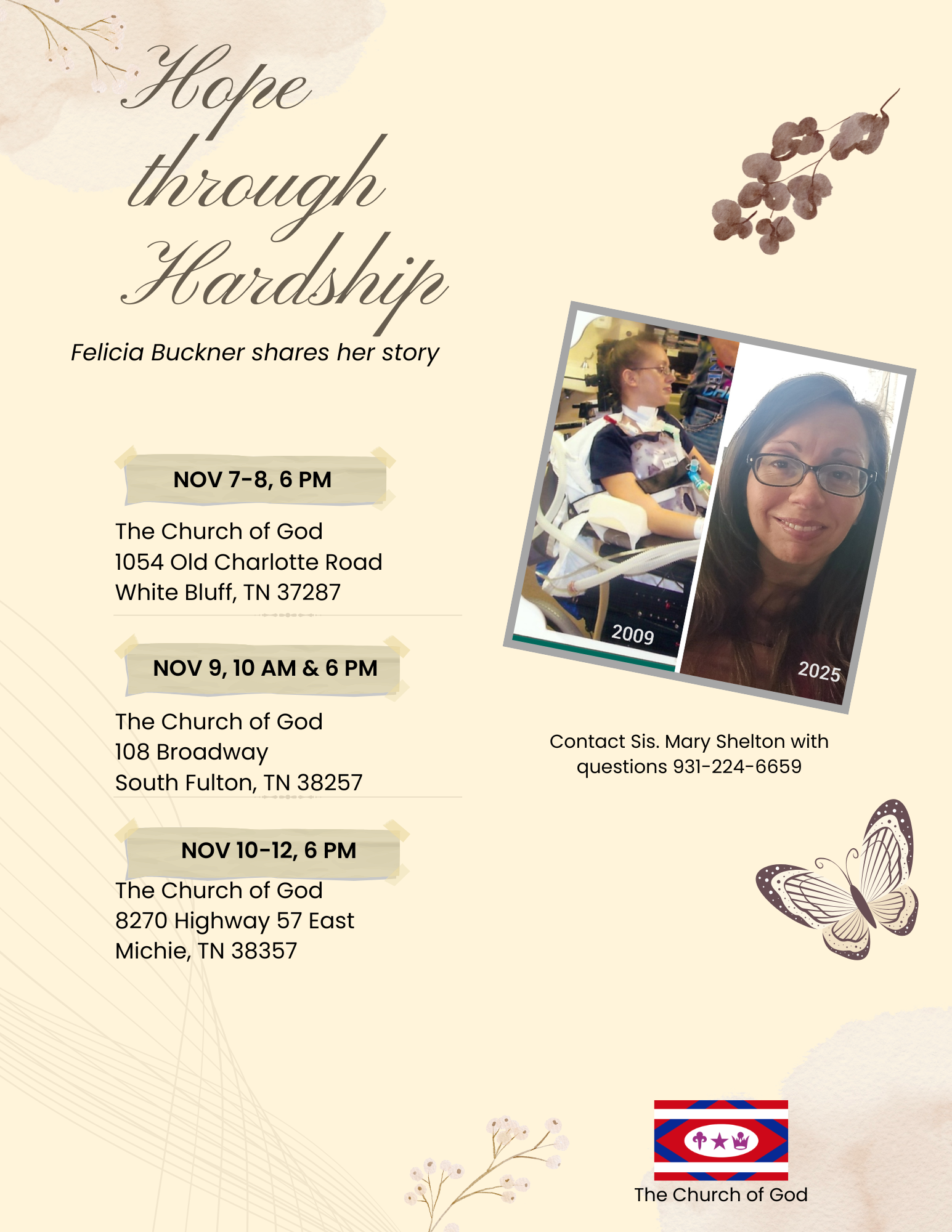 7 November 6:00 pm - 8:00 pm White Bluff Local Church 1054 Old Charlotte Road White Bluff, TN 37287 Testimony Service with Felicia Buckner Join us for a special testimony service with Sister ...